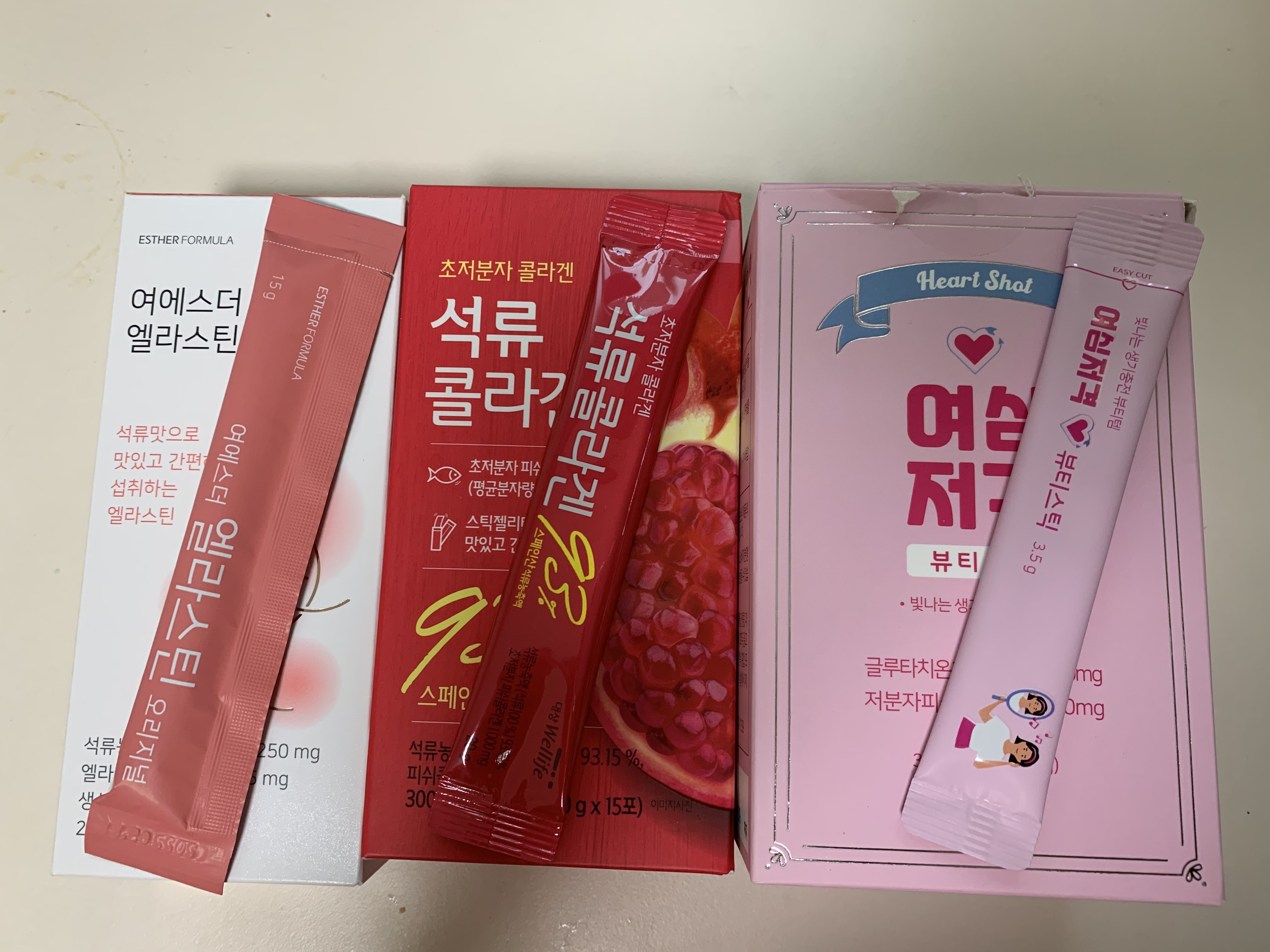 그리고 인터넷에서 계속 봐왔던 '대상 석류 콜라겐'. 이 제품 또한 젤리 타입이고, 직장 동료가 가끔 주는 것을 먹어보았는데 꽤 괜찮길래 주문해 보았다. 오늘 도착한 이 제품은 효능은 먹어봐야 알 것 같지만 쫄깃쫄깃한 젤리 식감이라 맛은 제일 좋다.