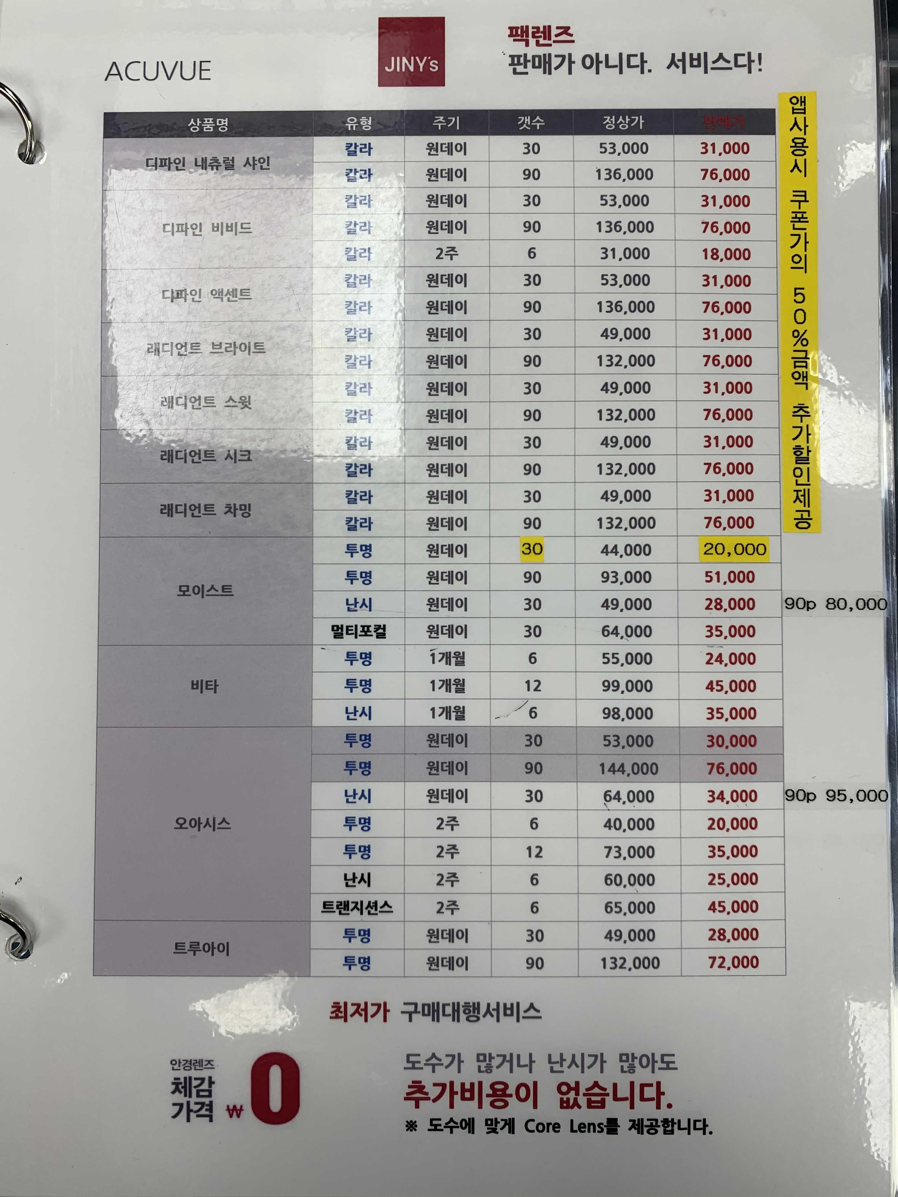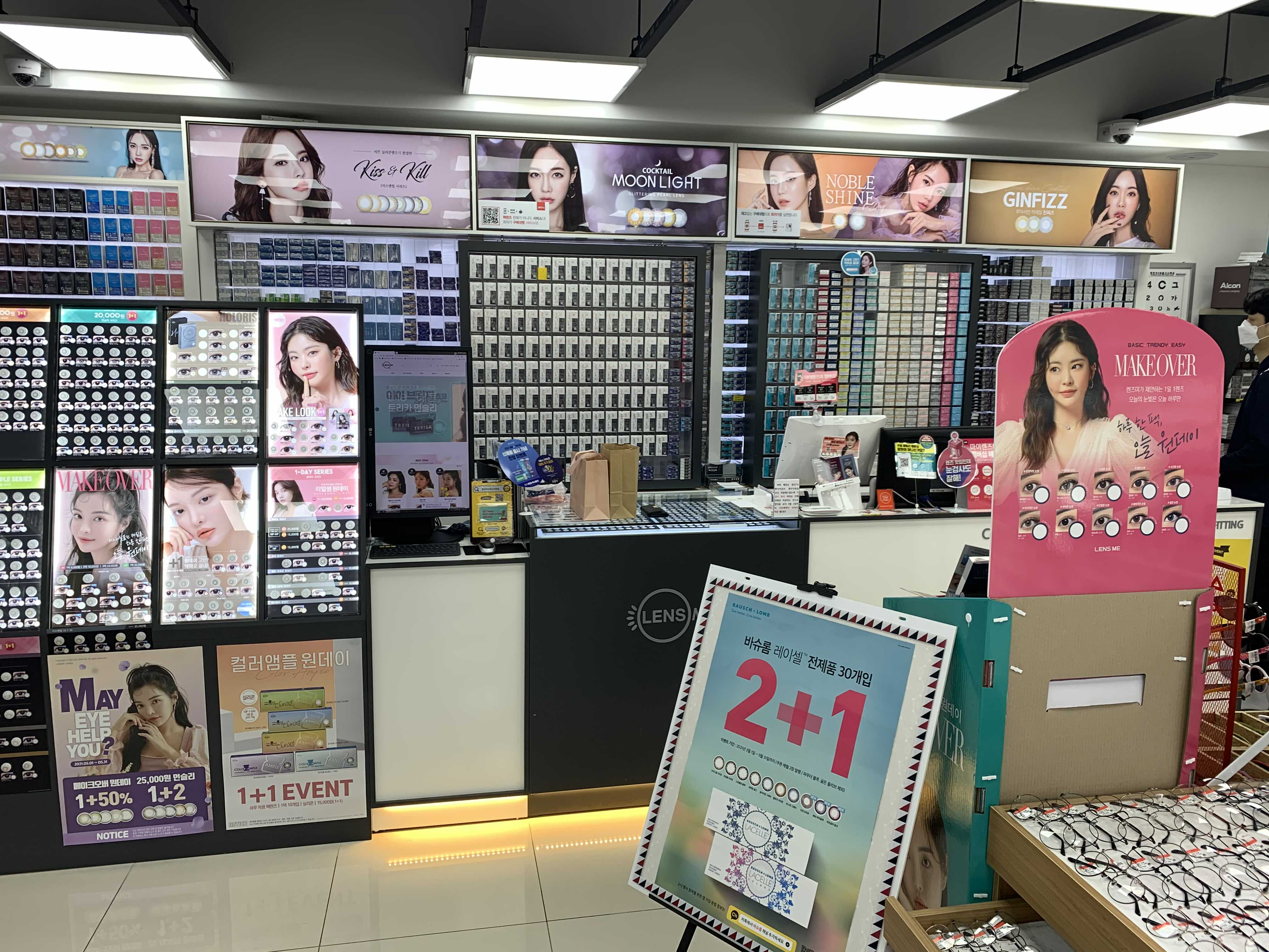 마지막으로 렌즈도 렌즈미라는 이름으로 함께 운영 되고 있었는데 엄청난 할인이 되고 있었다. 내가 산 것은 90팩인데 추가 서비스에다가 역시 할인혜택!!