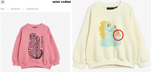 해당 상품은 ‘시베리아횡단철도를 탄 미니로디니–종착역:서울’ 컬렉션으로, 한국 민화를 차용한 듯한 호랑이 그림과 함께 브랜드명인 ‘미니로디니’를 한글로 써넣은 디자인이 대표적이다. 또 유니콘 캐릭터가 ‘최고의 국수’라고 쓰인 그릇 속 면발을 젓가락으로 집고 있는 모습을 담은 상품도 있다.