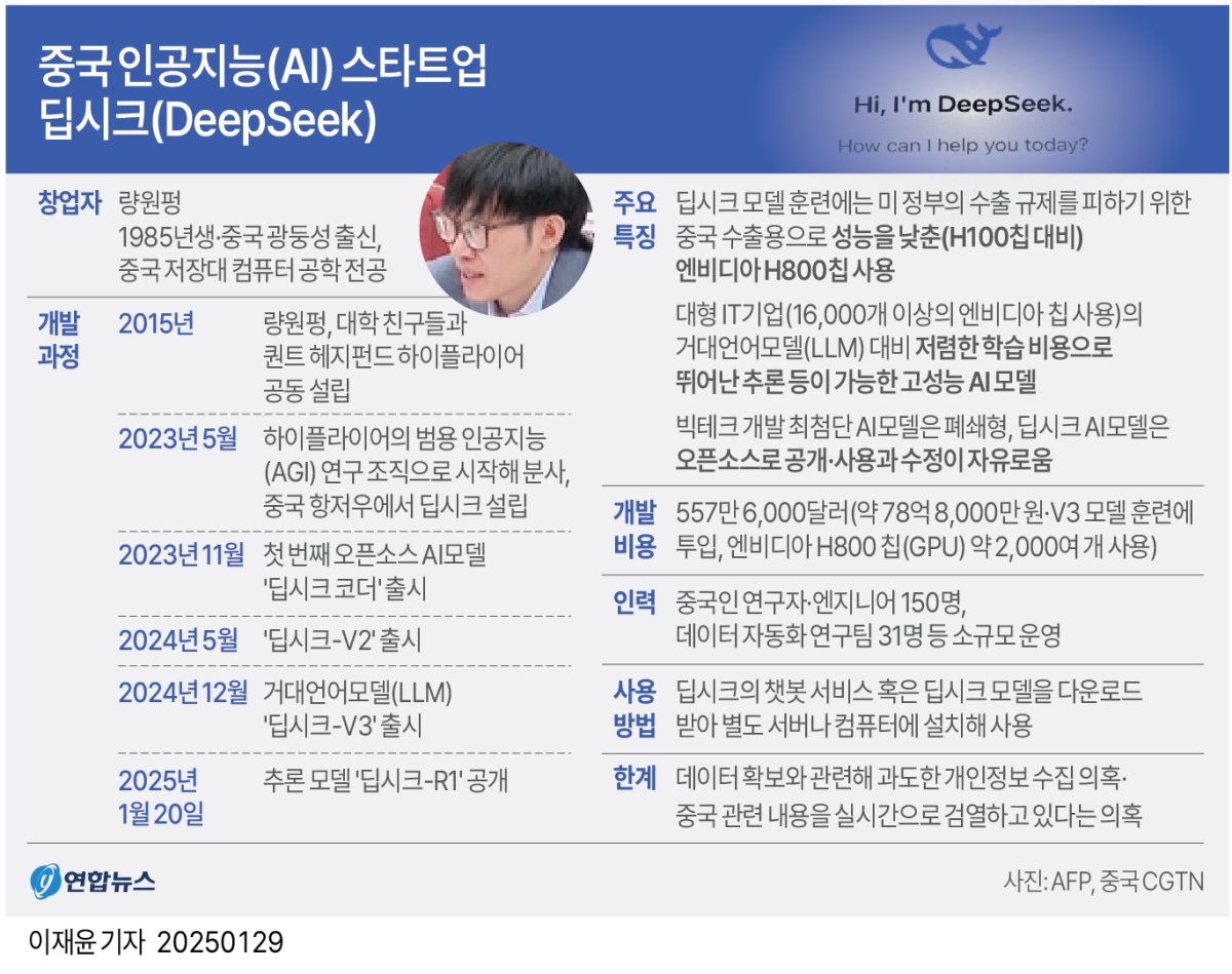 최근 중국 AI 스타트업 딥시크(DeepSeek)가 강력한 언어 모델을 출시하며 글로벌 AI 시장에서 파장을 일으키고 있습니다. 이로 인해 AI 관련 기술주가 급락하는 등 시장 변동성이 커지고 있으며, 투