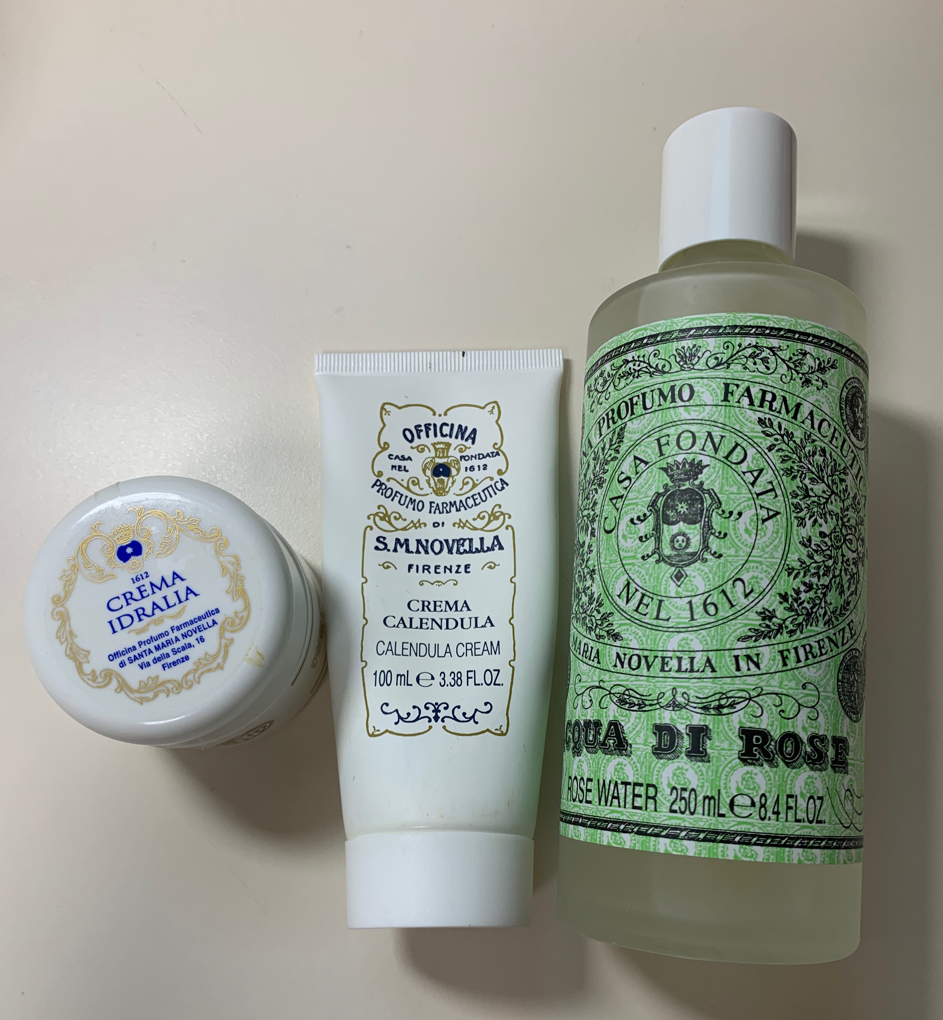 우선 향수는 제외하고(향수 후기에 있다), 산타마리아노벨라 제품은 총 3개이다. 먼저, 장미수 토너 250ml, 카렌듈라 크림 100ml, 크림 이드랄리아 50ml이다.