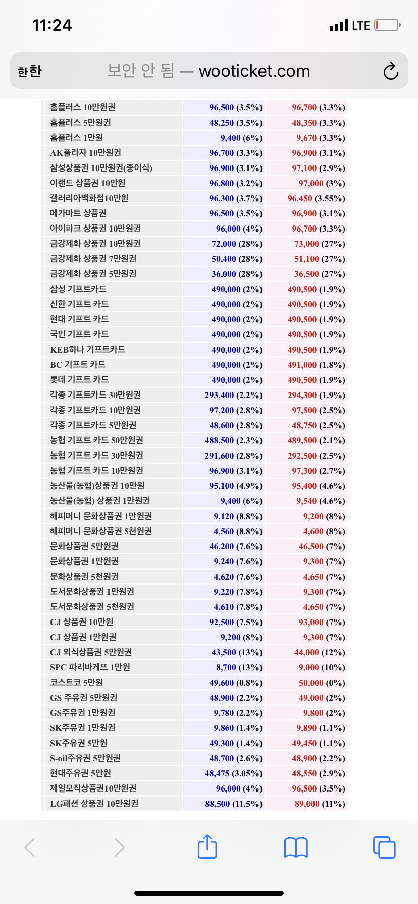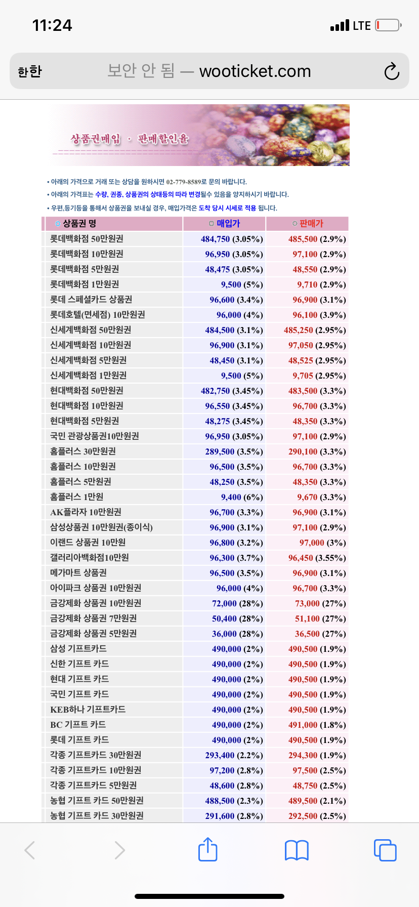 우천상품권 이라는 곳이고, 역과 버스정류장과 근접해 있으나 꽤 찾기가 어려우니 처음 갈 땐 지도를 참고할 것. 위치는 명동역과 을지로 부근으로, 주말에도 영업을 한다. 아래 리스트의 상품권을 모두 받으며, 친절하게 가격표도 나와 있다. 매입가격은 상황에 따라 달라질 수 있다고 한다. 우편, 등기로도 받는다고 한다. 처음 방문했을 때 이미 입소문으로 유명한 곳이었는지, 줄서서 기다렸고 내 차례가 되어 미리 확인한 금액과 일치 여부를 확인한 뒤 바로 계좌로 이체되는 것까지 확인하였던 기억이 난다.