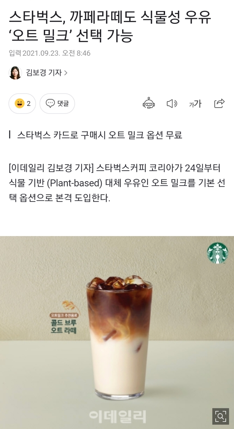 개개인의 취향을 반영한 오트밀크가 스타벅스에 반영된다. 스벅 카드 구매 시 옵션 변경은 무료라고 한다.