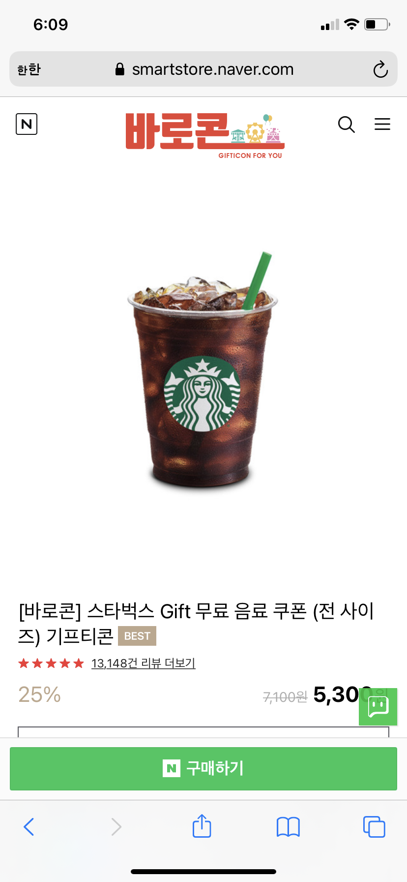 네이버 페이에서 구매 가능하다. 5300원으로 모든 음료 사이즈 상관없이 구매할 수 있다. 또한 나중에 바로콘구매 시 포인트도 적립 가능하니 쏠쏠하게 사용가능하다.