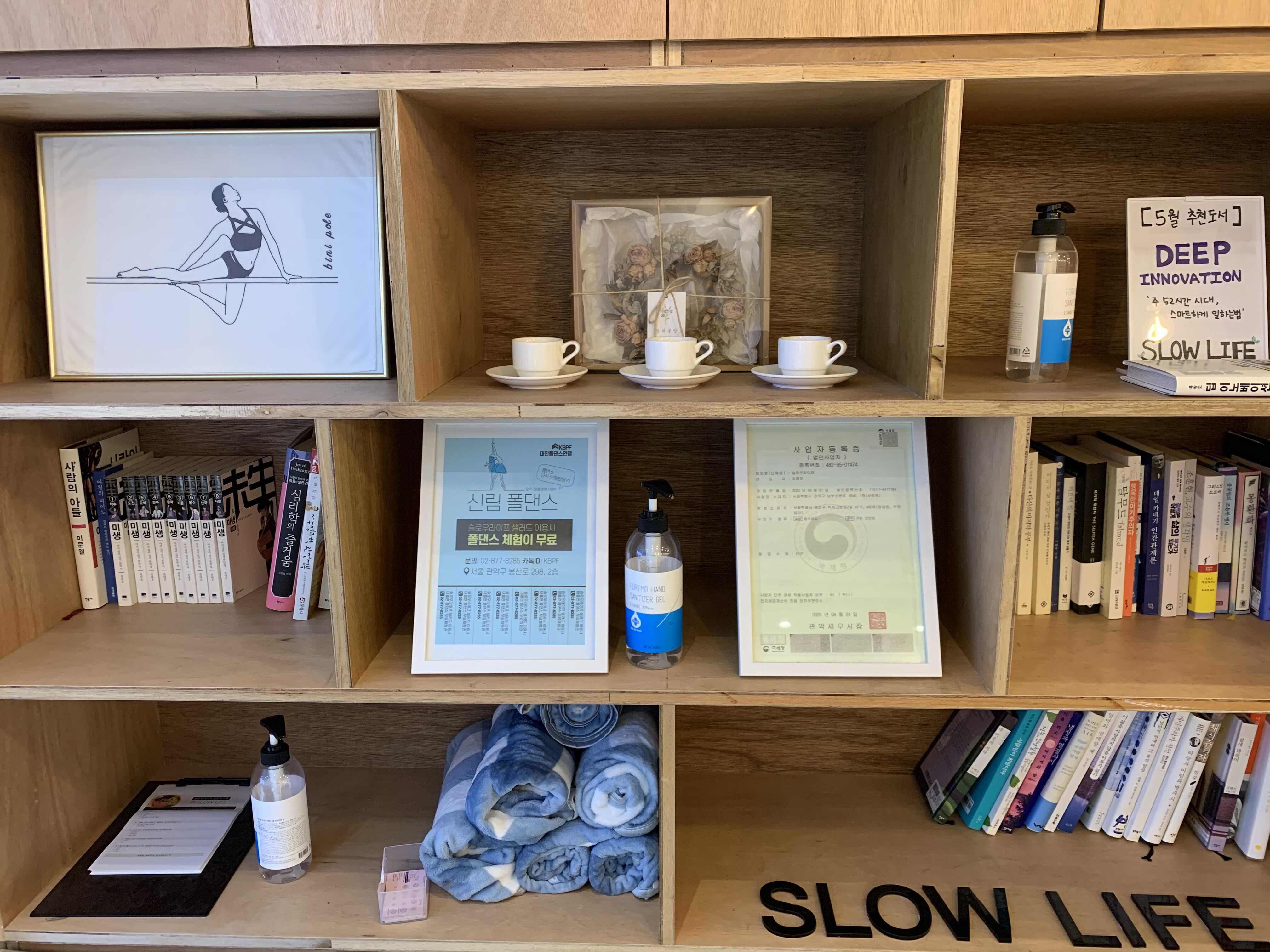마지막, 조용하고 아늑한 카페 분위기다. 대한폴댄스연맹에서 제휴를 맺어 운영하는 곳인데 북카페처럼 조용히 책을 읽을 수 있게 한 켠에 이달의 책을 포함하여 많은 책들이 구비되어서 심심하지 않게 꾸며져 있었다. 아늑하고 푹신한 쇼파와 일인용 자리가 있는 것도 좋았다.