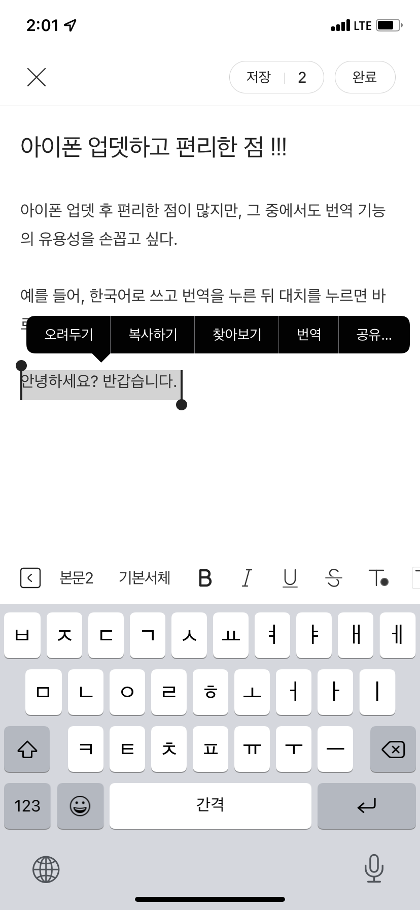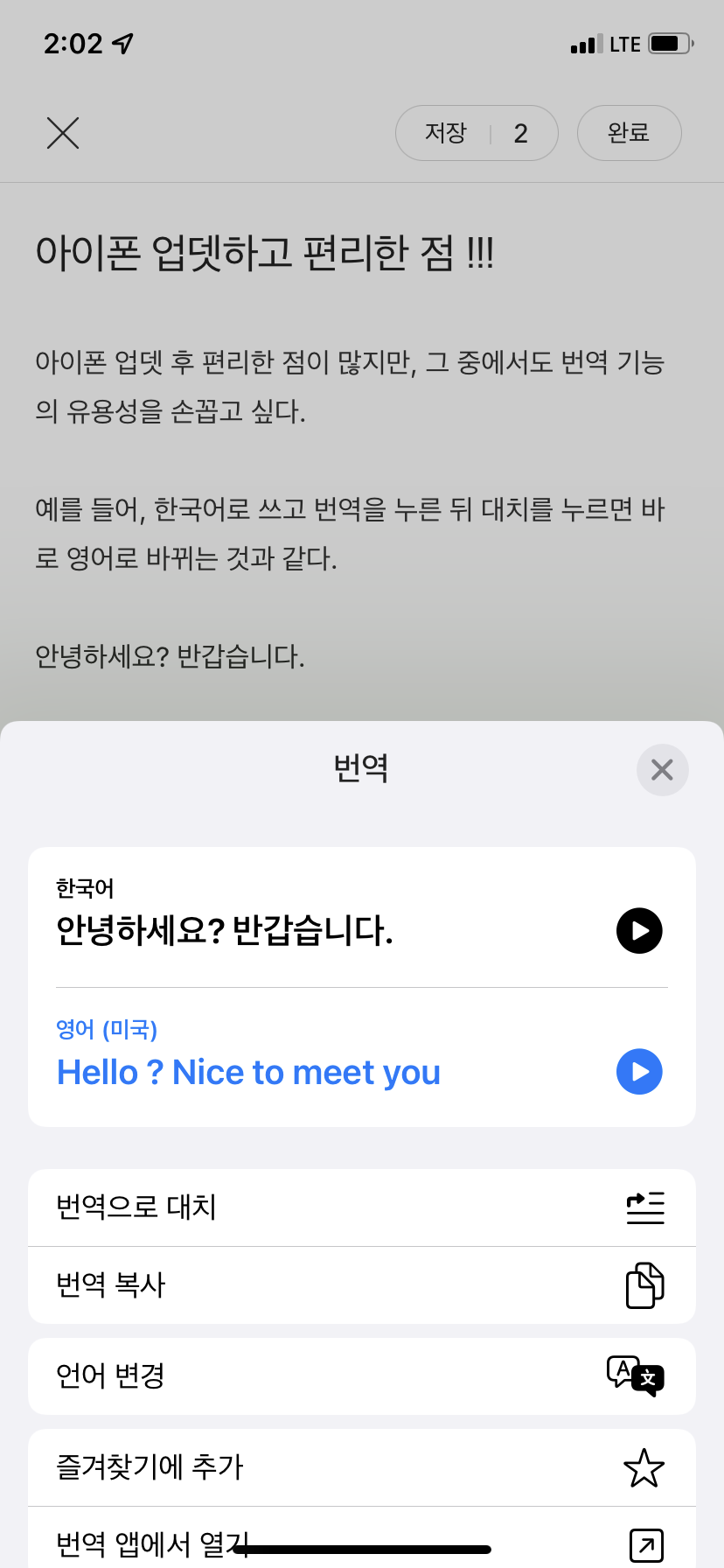 아이폰 업뎃 후 편리한 점이 많지만, 그 중에서도 번역 기능의 유용성을 손꼽고 싶다.