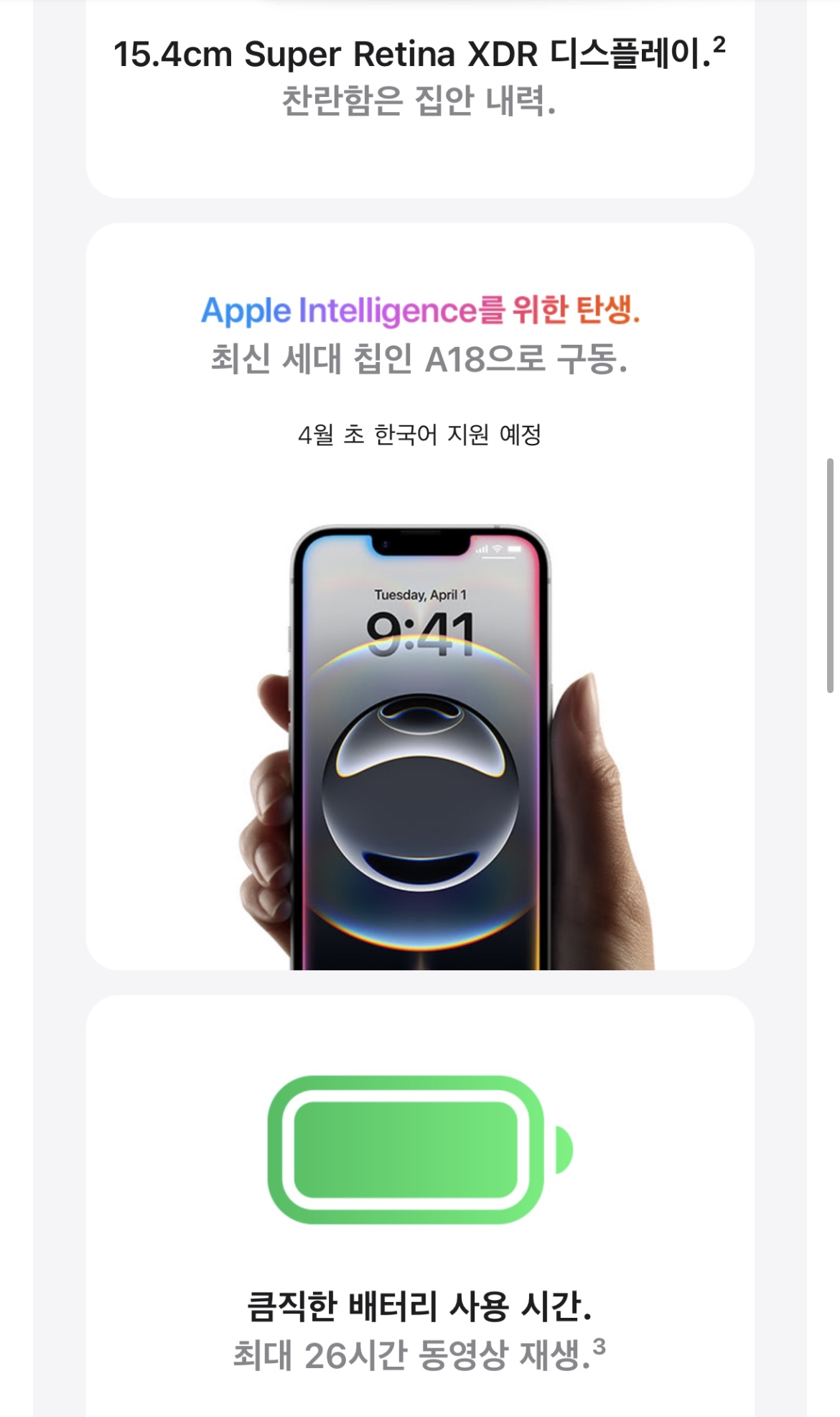 배터리 | 아이폰 14 수준의 배터리 개선 | 아이폰 8 수준의 배터리 성능 |