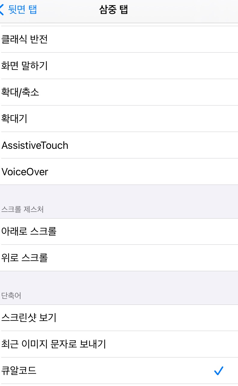 나는 삼중탭을 했는데, 이걸 선택하면 맨 아래에 어떤 동작을 할 것인지 선택할 수있고 단축어로 입력해둔 큐알코드를 지정하면 된다.