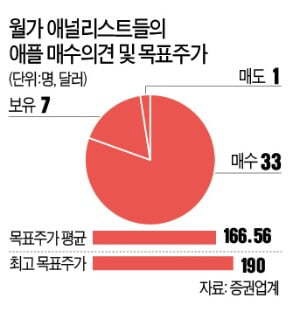 월가도 애플에 대해 긍정적 전망을 내놓고 있다. 40명의 월가 애널리스트 중 33명이 매수 의견을 내놨다. 7명은 보유, 1명만이 매도 의견이다. 이들의 목표주가 평균은 166.56달러다. 최고 목표주가는 190달러다.