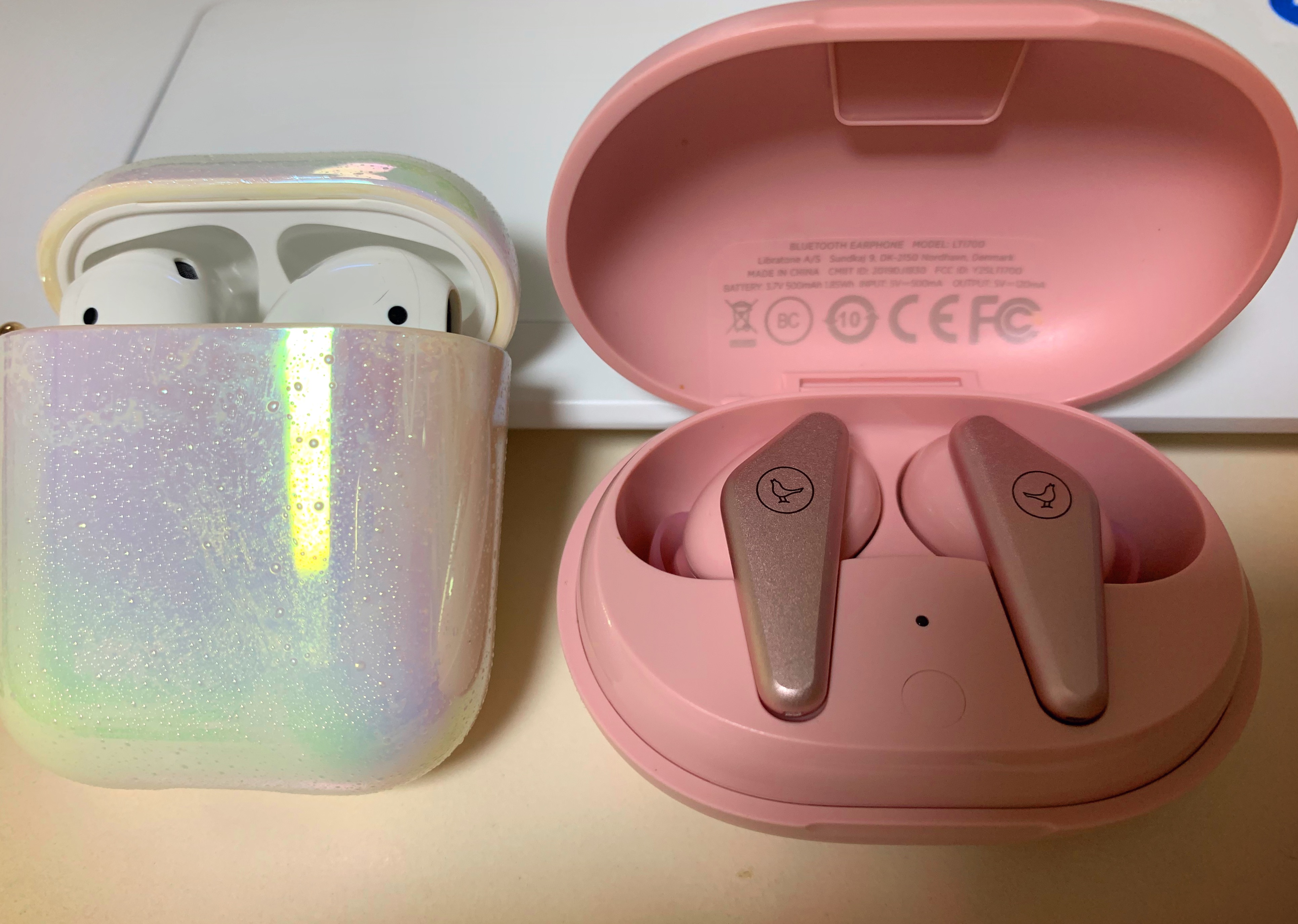 리브라톤(핑크)은 상대적으로 에어팟2에 비해 짧은 재생시간이 아쉬웠지만, 예쁜 케이스와 반커널형으로 러닝을 해도 절대 빠지지 않는 이어폰인 것이 장점이었다. 역삼각형 모양을 한 이어폰 디자인도 비싼 가격을 차치할 만큼 매력적이었고. 그런데 가끔 아이폰과의 연결에서 인식이 느려지거나 잘 안먹히는 등의 오류가 있었다. 하지만, 사용자가 직접 설정하여 이어폰을 한번 탭하면, 두번 탭하면, 세번 탭하면 어떤 기능을 작동시킬 수 있는지가 가능해서 익숙해지면 매우 편리했다.