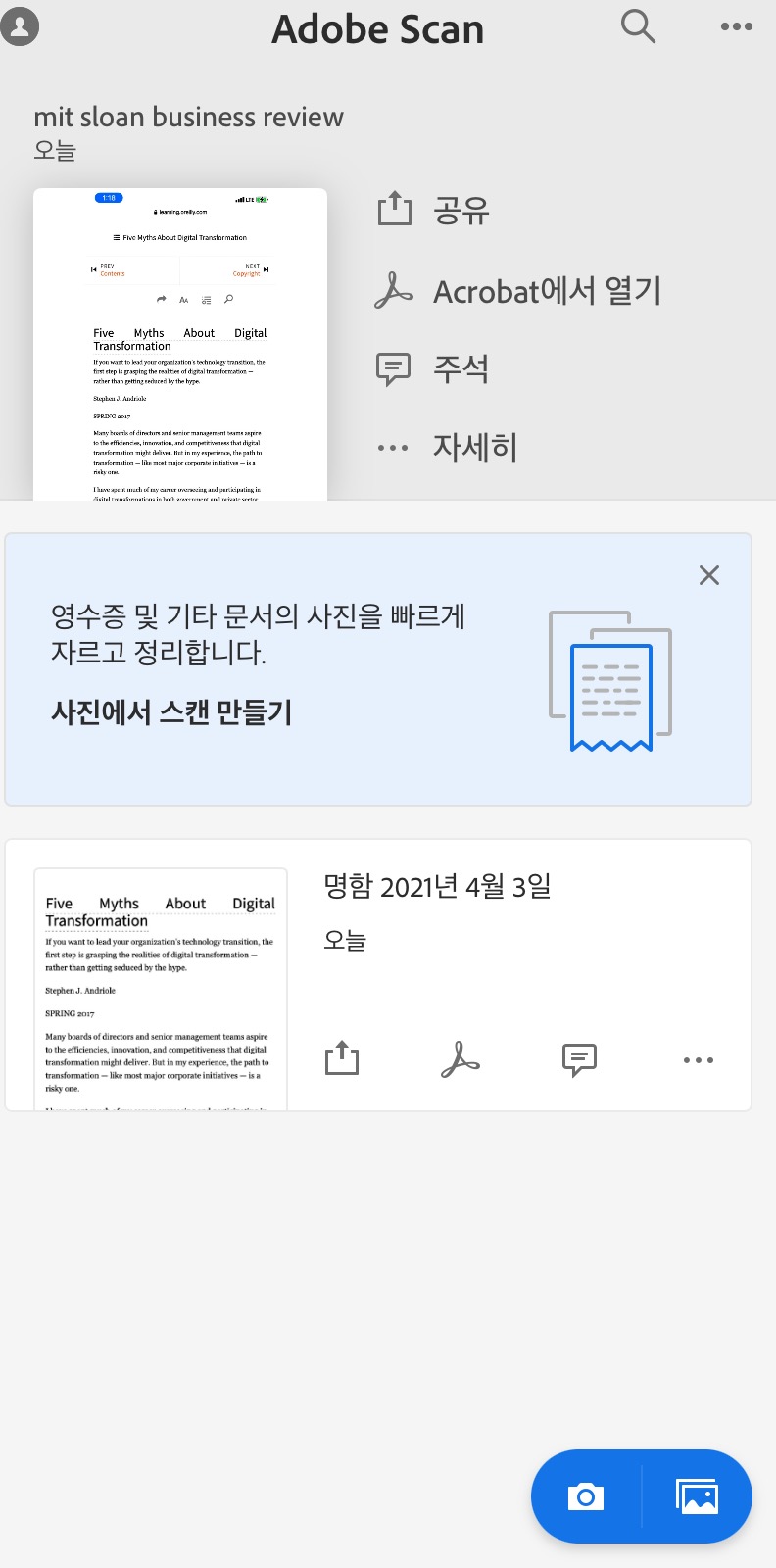 그런데, 간혹 pdf파일로 다운로드가 되지 않는 경우가 있는데, 이 경우 파일화가 안되어서 저장과 추후 활용이 힘든 것이 사실이다. 이러한 불편함을 해소할 수 있도록 하는 앱이 있는데, Adobe Scan이 그것이다.