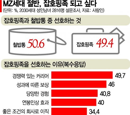 누가봐도 ‘번듯한’ 직장을 그만두는 2030 세대가 늘고 있다. 이름만 들으면 알 만한, 다들 부러워하는 직장도 5년 내에 그만두고 입사와 함께 퇴사를 꿈꾸는 이들이 요즘 신입들이다. 최근 구인구직 플랫폼 사람인이 기업 500개사를 대상으로 ‘1년 이내 조기퇴사자’ 현황을 조사한 결과, 49.2%가 ‘MZ세대(1980~2000년생)의 1년 이내 조기퇴사자 비율이 높다’고 답했다. 1년 내 조기퇴사자들은 입사 후 평균 5개월 이내에 퇴사를 결정하는 것으로 집계됐다. 취업난이 심각하다는데, 요즘 신입들은 왜 굳이 어렵게 입사한 회사를 금세 박차고 나오는 것일까. 왜 ‘철밥통(한 곳에 평생근무)’을 마다하는 것일까.