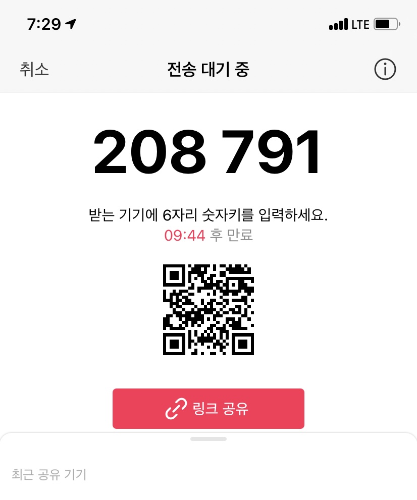 이 사진을 선택했다고 하면, 함께 데스크탑에서도 동일한 앱을 깔고 실행해 준 후 받기를 클릭한다. 그러면 폰의 화면에서는 다음과 같은 코드가 생성된다.