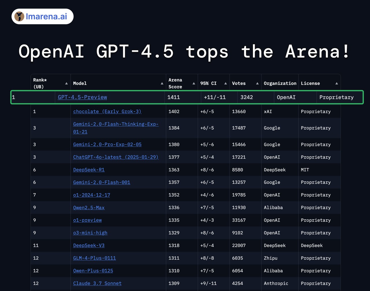 GPT-4.5가 AI 모델 평가 플랫폼에서 인간 선호도 평가 1위를 차지하며 OpenAI의 기술력을 다시 한번 입증했습니다. 챗봇 아레나에서 경쟁을 벌인 결과, GPT-4.5는 놀라운 성능을 선보이며 사용자들에게 가장 선호되는 AI로 등극했습니다.