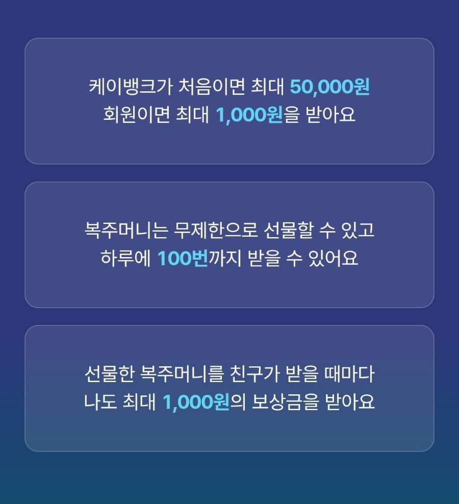복주머니를 선물하기를 누르면 친구에게 링크를 공유할 수 있어요. 케이뱅크가 처음인 사람은 최대 5만원을, 기존회원이면 최대 1천원을 받는다고 하며, 하루에 무려 100번까지 받을 수 있다고 하니 굉장히 쏠쏠하네요.